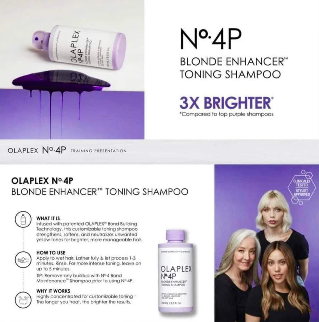 Nº.4P repara, limpia y tonifica con la tecnología OLAPLEX patentada para todos los cabellos rubios, aclarados y canosos.